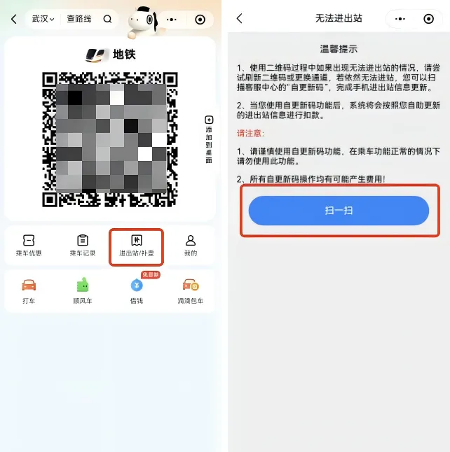 使用滴滴乘车码无法进出站时,可前往客服中心,按工作人员的指引,在乘车码界面点击“进出站/补登”按钮,在无法进出站界面点击“扫一扫”,扫描客服中心显示屏上的自更新码进行自助更新,更新完后方可正常进出站。