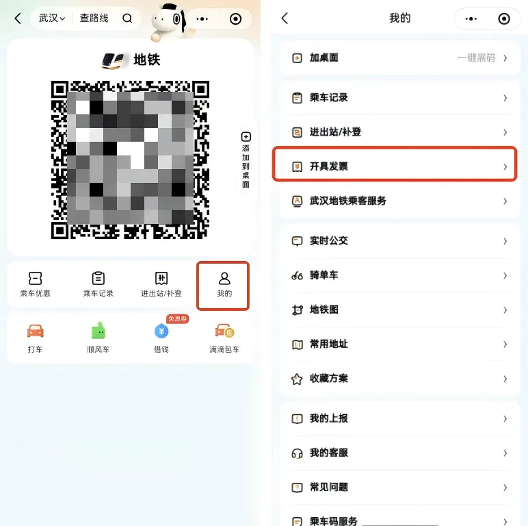 在乘车码界面右下角点击“我的-开具发票”,选择相应行程并填写信息,即可开具发票。