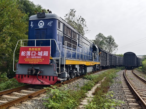 11月12日1时许,一列满载810吨日用品、食品、药品、小家电等“双11”电商物资的79385次列车从中国铁路武汉局集团有限公司(下称“武铁”)舵落口车站开出,全程1306公里,1天左右即可到达四川省成都市城厢货运站,这是武铁为服务“双11”电商物资运输开行的首趟专列。