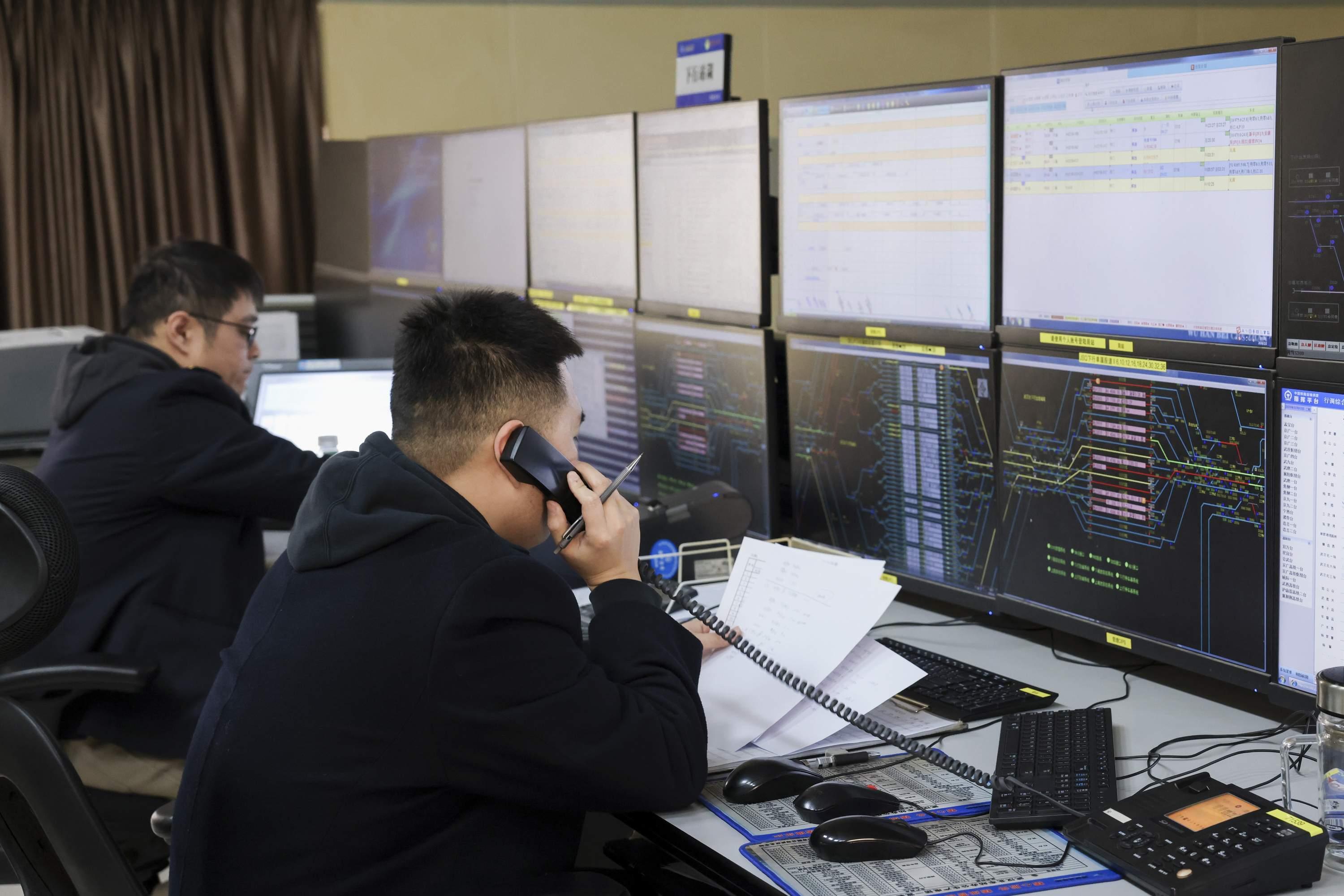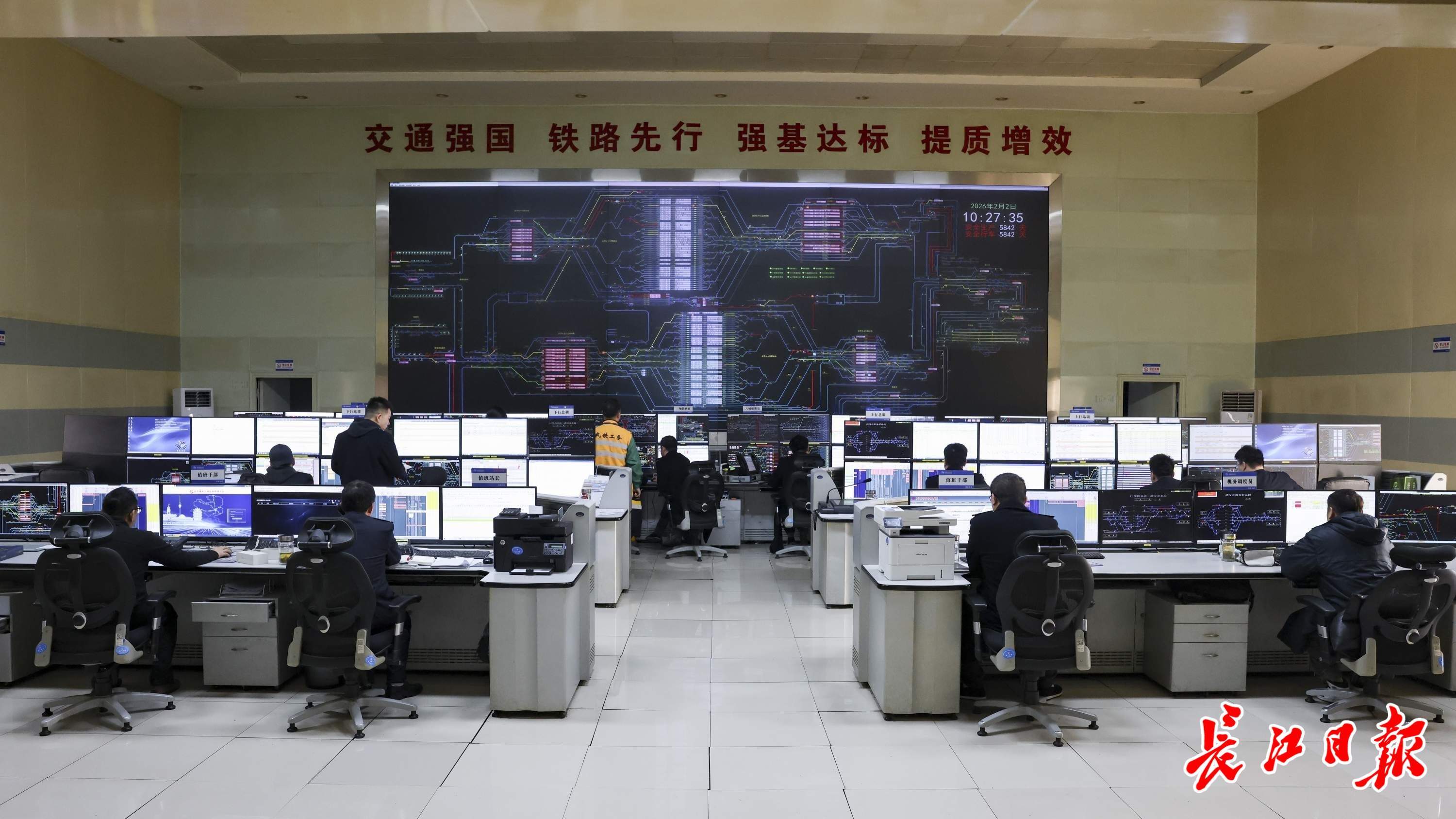 调度大厅内,中央大屏上代表轨道的线条密密麻麻但整齐有序,仿佛一个精密的芯片设计图。每台电脑前,工作人员都在忙碌着,频繁地接打电话。调度车间值班站长代斌介绍,2009年5月18日,占地6700亩的武汉北编组站正式开通运营。经过扩能改造升级,站线数量从2009年建站开通时的130条增加到目前的172条,日办理车能力超过3万辆。