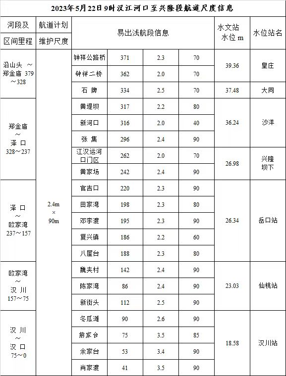 汉江河口至兴隆段航道尺度信息(2023年5月22日9时)