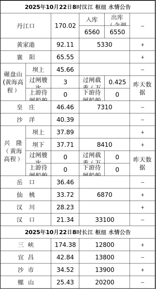 水情公告(2025年10月22日8时)
