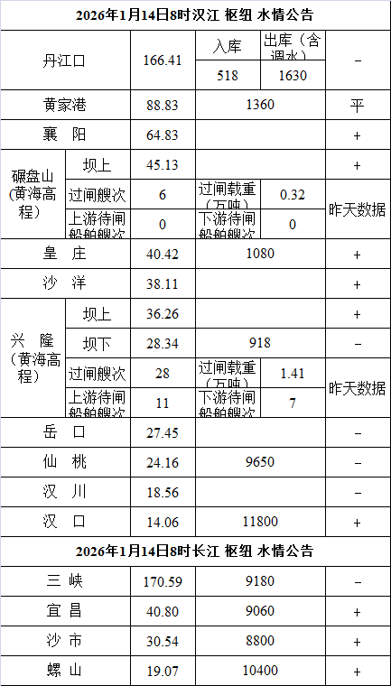 水情公告(2026年1月14日8时)