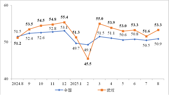 图1 2024年8月-2025年8月全国和武汉物流业景气指数走势图
