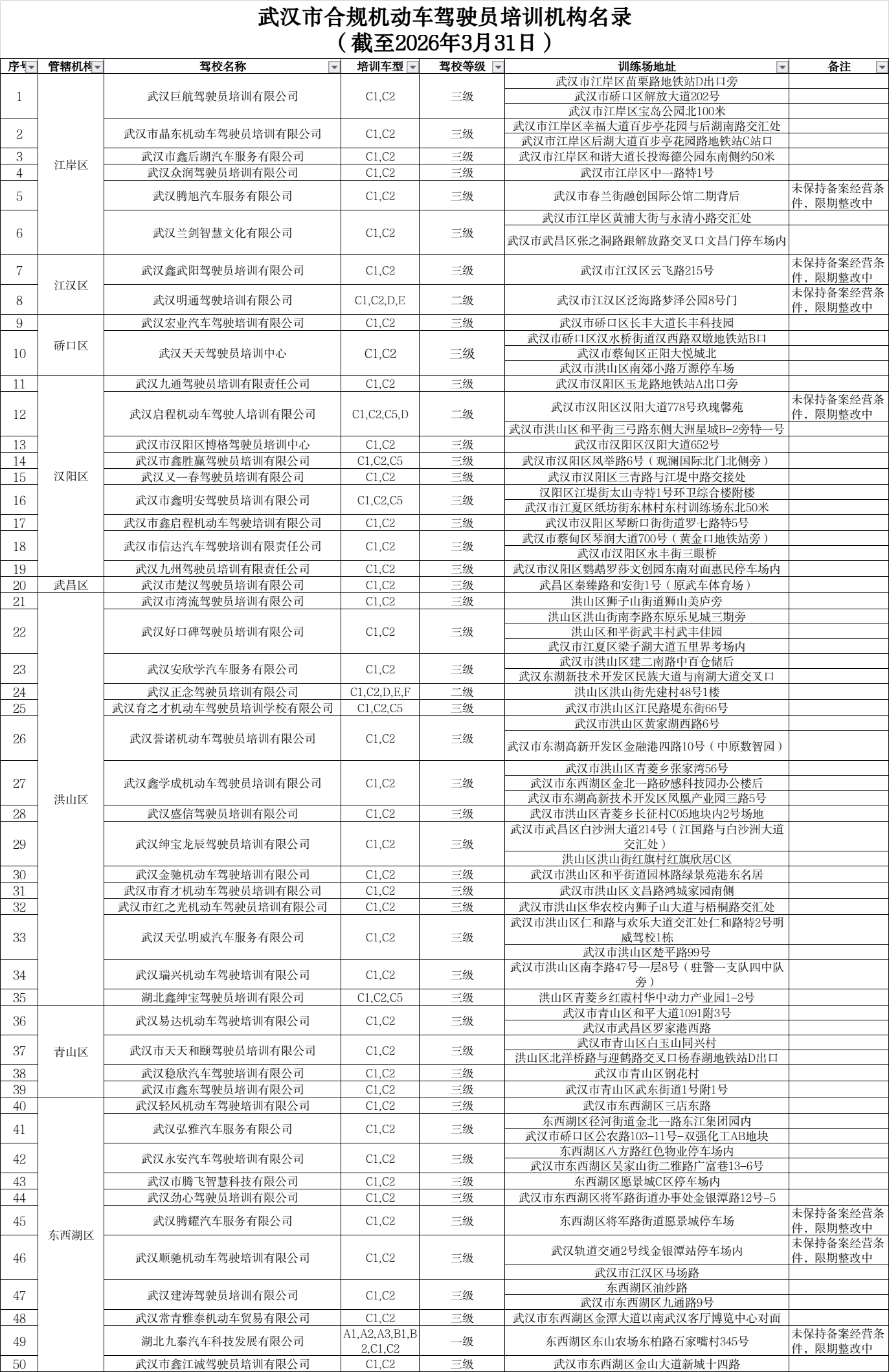 附件:武汉市合规机动车驾驶员培训机构名录(截至2026年3月31日)