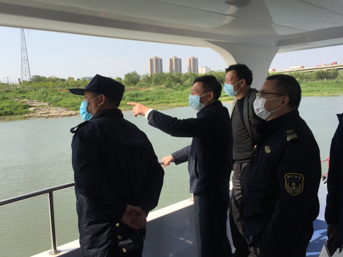 4月13日,在我市推进各行业全面复工复产的启航时刻,市交通局总工王益光带队乘船巡查汉江武汉段,对我市水运行业开展调研督导。市交通局港航处处长朱东明、副处长褚瑞,市港航局局长王传凯、副局长胡定国等参与调研。