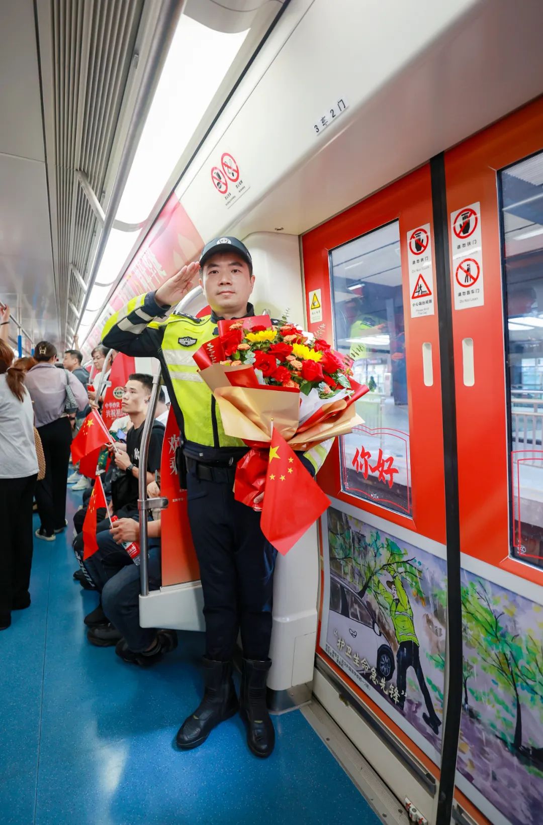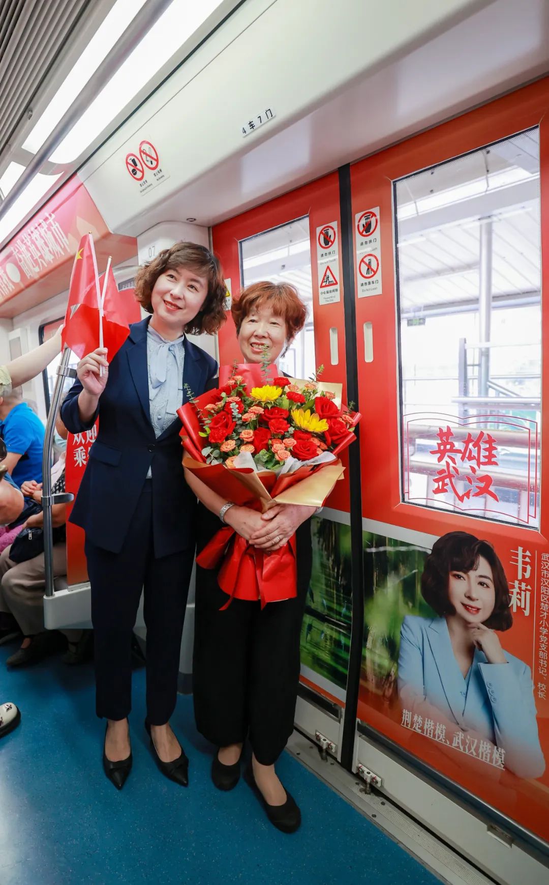 平凡铸就伟大,英雄来自人民。发车仪式上,“书信校长”韦莉、“湿地守护者”冯江、“最美消防卫士”朱雪亮、“见义勇为勇士”詹少萍、“护卫生命急先锋”邓国锐等新时代英雄城市人物代表亮相现场。他们是万千“英雄的人民”中的普通一员,却在平凡岗位上铸就不凡。现场,他们接过少年献上的花束,在来往市民的注目与致敬中,伴随着“陀螺站长”姚婕录制的“英雄武汉”定制地铁语音祝福的播报声,光荣登上列车,开启全新的英雄之旅。