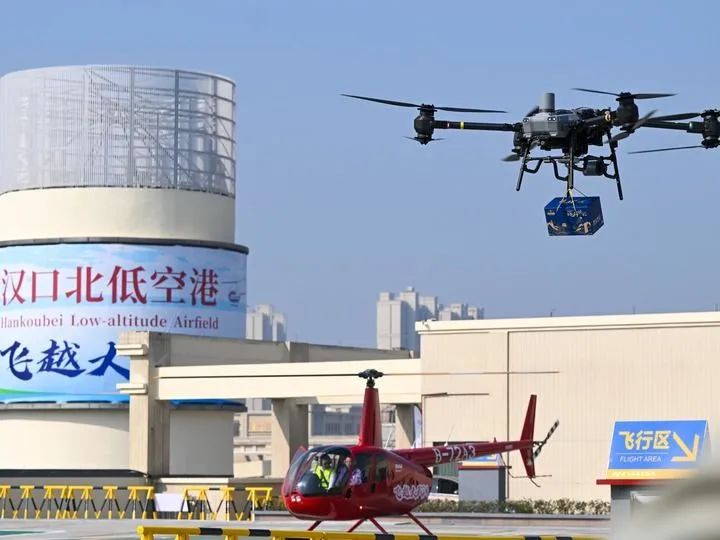 装配快递盒的无人机在汉口北低空港无人机停机坪起飞。新华社记者 肖艺九 摄