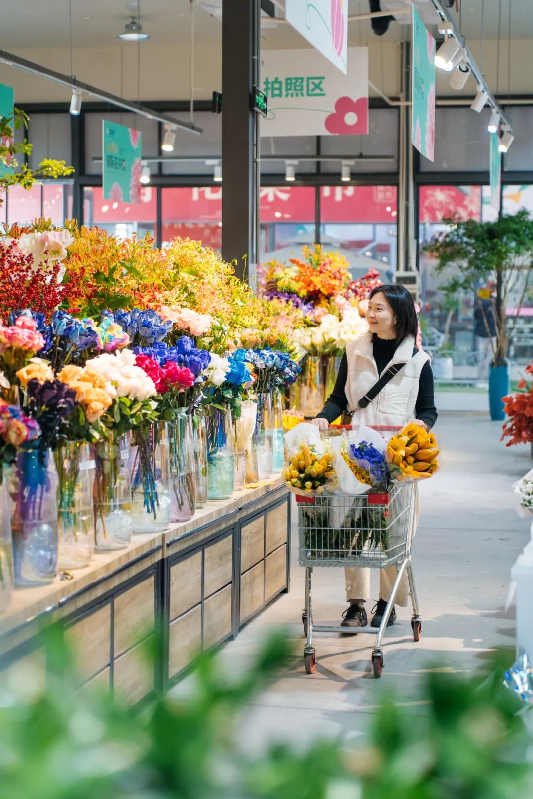 市民程女士专程开车从武昌来鲜花小镇买花。她说,汉口北现在很适合周末打卡,她和家人经常过来玩,买鲜花、吃海鲜、喝咖啡、逛宠物店。