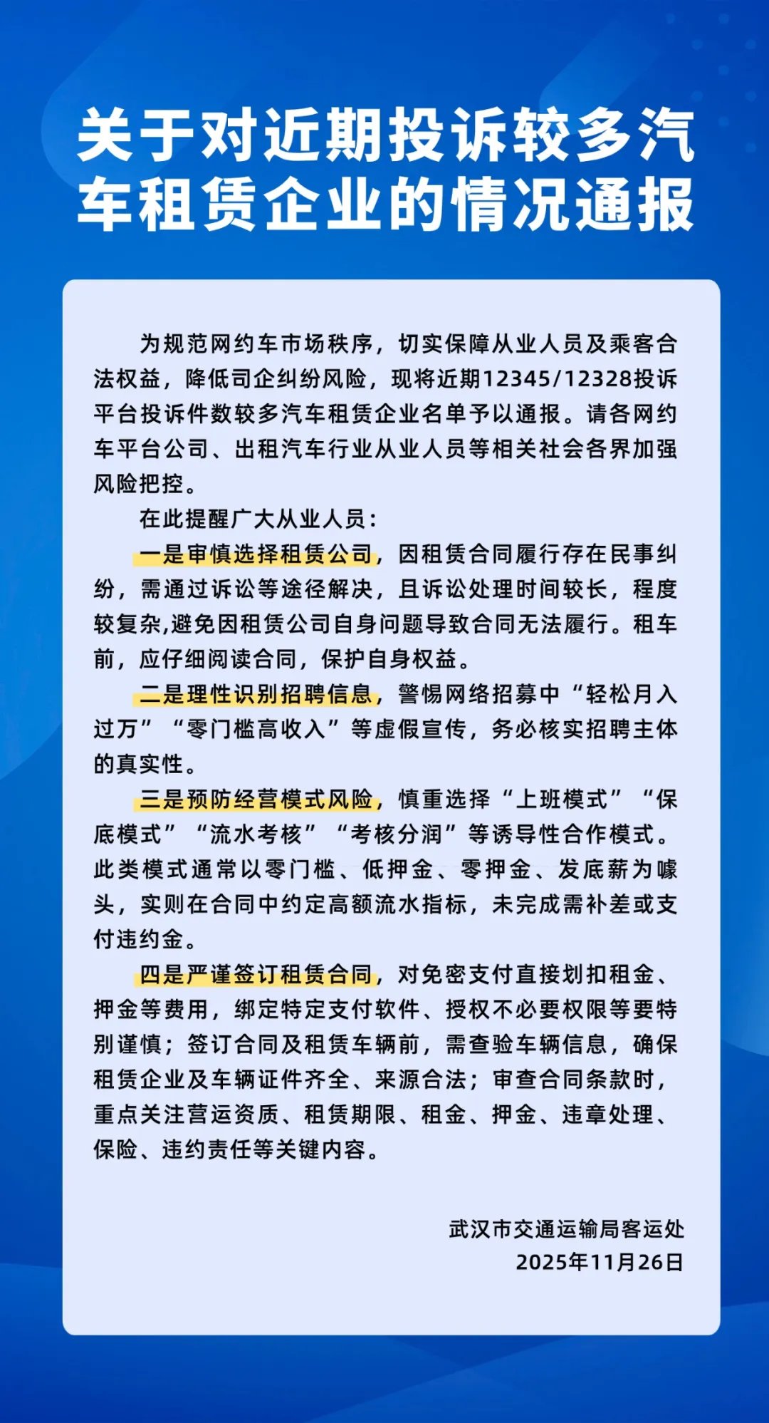 以上企业涉及投诉主要问题包括:押金问题、退车问题、合同纠纷、涉嫌安排无证车辆、车辆维修问题等。在此提醒有意从事出租汽车经营的人员理性评估营运收入,审慎入市从业,并警惕防范霸王合同条款、自动划扣资金、代收代发流水、“以租代购”、非合规营运、退押金难等风险。