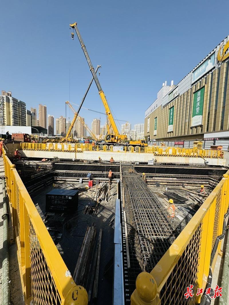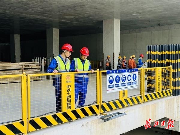 现场看到,钢筋工、模板工和混凝土浇筑作业人员正协同作业,进行车站最后一块顶板的施工。“可以将车站想象成一个地下建造的长方形箱体,顶板就是箱体的盖子。封顶意味着箱体的底板、四周墙体和顶板均已完工。”施工方中铁十四局余家头站工区经理林威介绍道。余家头站距离长江约750米,地处长江一级阶地,地质条件复杂,施工难度较大。建设团队严格执行“零渗漏”标准,通过推行工艺标准化,采用二次凿毛、定制十字接头止水钢板、预埋注浆管等工艺,强化混凝土原材料与浇筑过程的控制,确保车站结构“滴水不漏”。