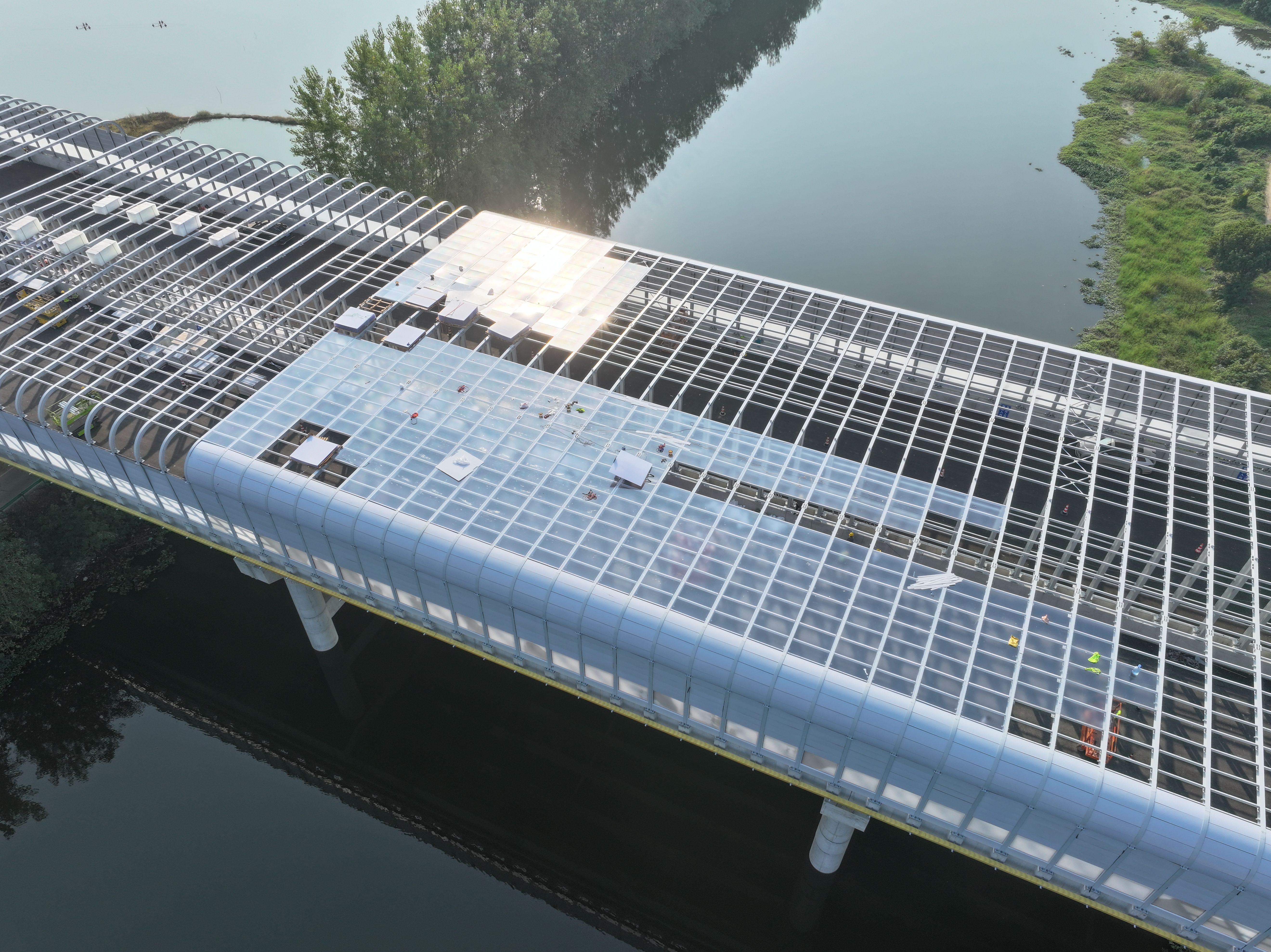 这座声屏障横跨34米,高6.38米,如一道柔美的银色臂弯环抱着湿地核心区。据项目参建方中交路建介绍,屏障采用透光率78%的亚克力磨砂屏体,既保证采光,又能通过漫反射防止鸟类误撞。这种细节考量,源于工程团队对生态保护的极致用心。