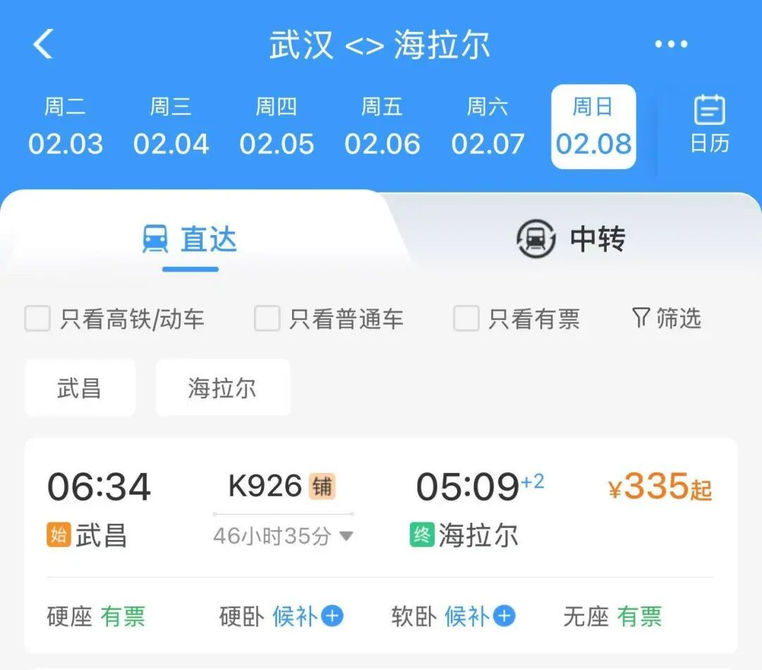 本次调图,首次开通了武昌—海拉尔方向的K926/7、K928/5次始发终到列车。记者查询12306App显示: