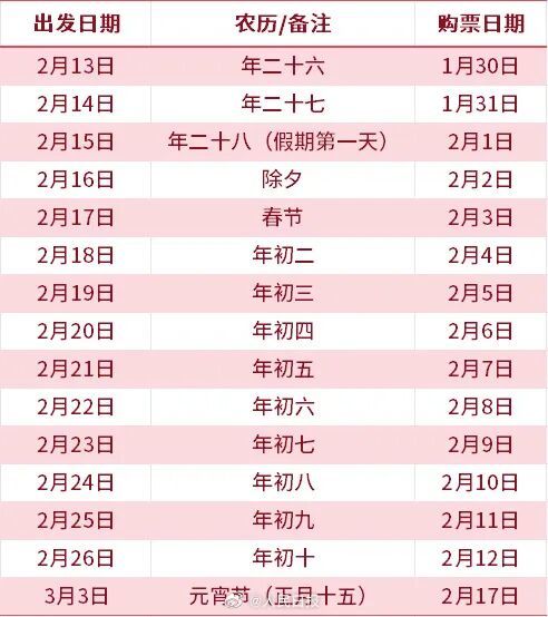 2月16日(除夕)车票将于2月2日起售。