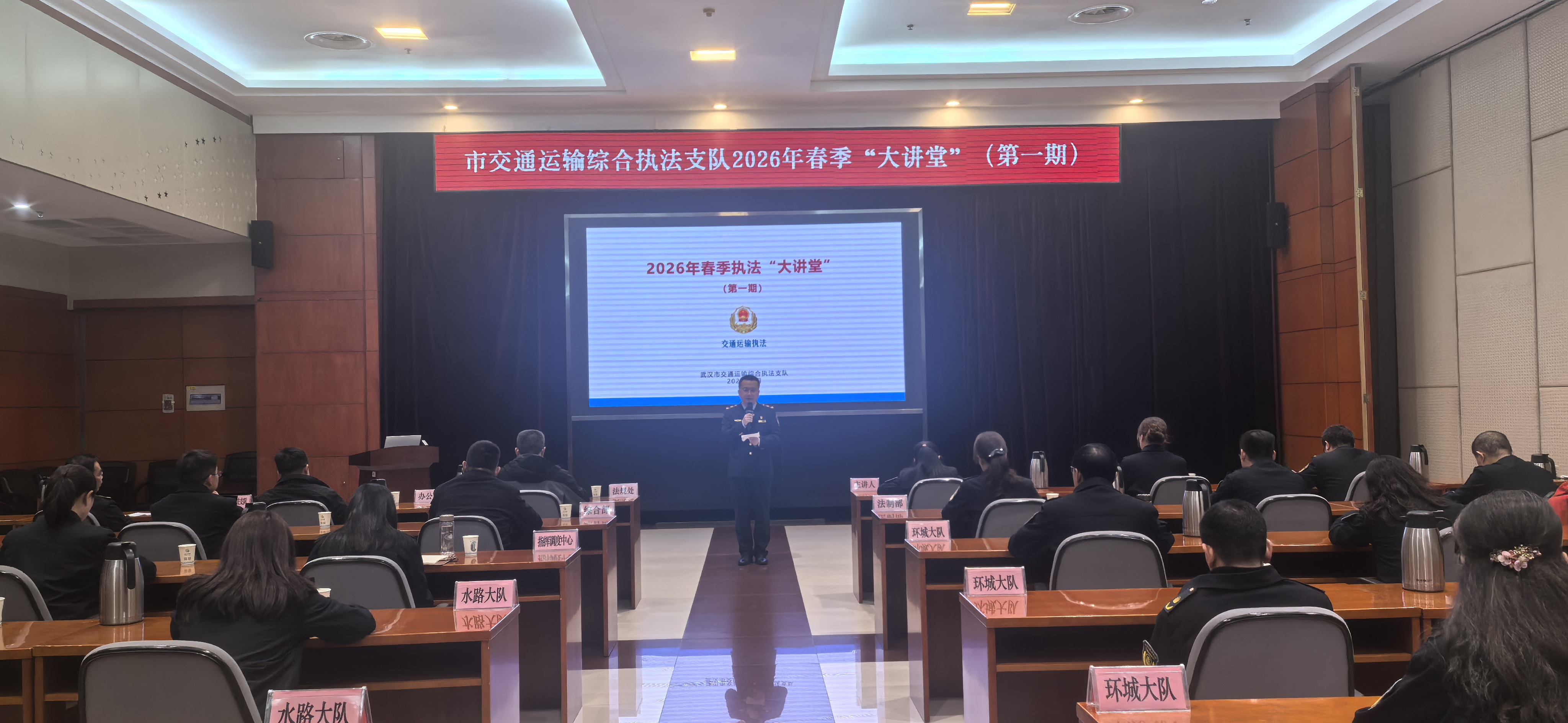 为持续深化武汉市交通运输综合执法队伍规范化建设,全面提升执法人员法治素养与履职能力,3月18日,市交通运输综合执法支队2026年春季执法“大讲堂”首期活动正式开讲,支队70余名执法人员参训,市交通运输局法规处(执法监督处)、市交通运输局办公室相关负责人及支队领导出席活动并现场点评讲话。