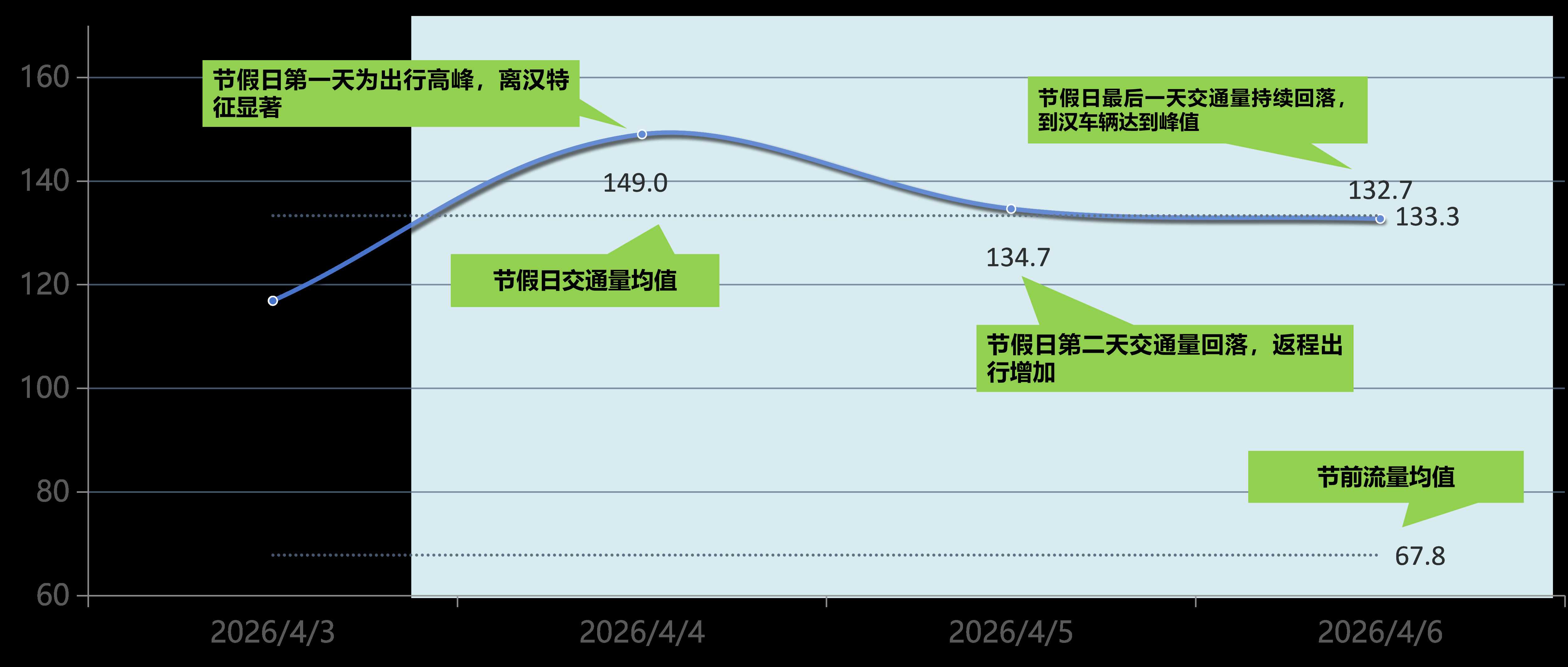 4月5日(假期第二天):离汉减少、返程增多,预计总流量134.7万台次,高峰9:00-11:00,10点峰值预计达10万辆/小时。