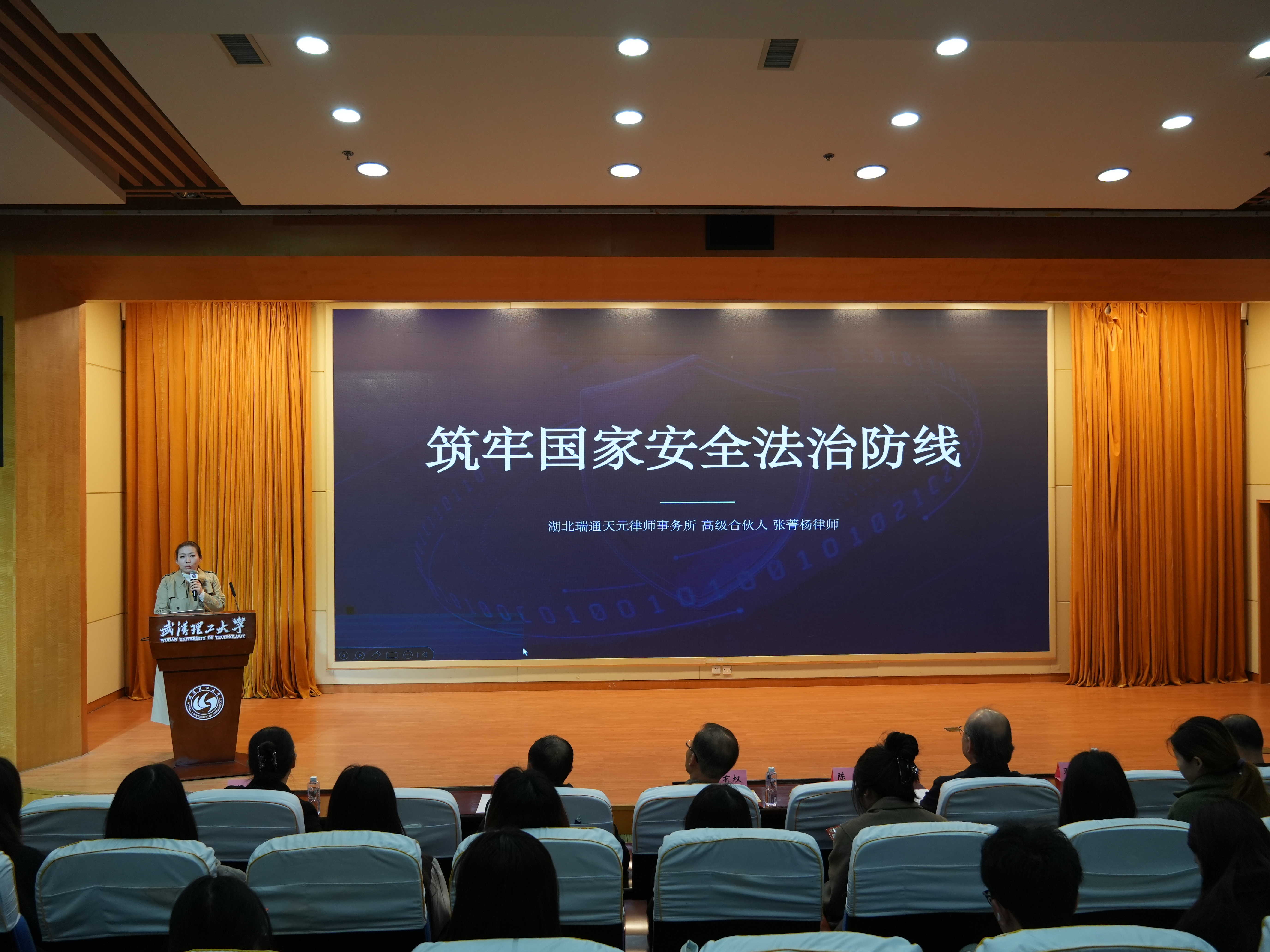 市交通运输局法学专家工作室成员为师生们带来了主题宣讲:北京观韬(武汉)律师事务所主任何应伟从国家安全教育日的由来入手,解读总体国家安全观的内涵。从科研保密、消防安全、信息刺探3个方面剖析校园内国家安全防范风险点。长江新区城管综合执法局郭煕锋分析当前美以伊军事冲突引发的能源价格剧烈波动,国际航运通道受阻,全球供应链面临严峻挑战,提出交通安全与国家安全的紧密联系。呼吁广大青年学子要以专业所学守护国之大者,以青春之力筑牢安全防线。市交通运输综合执法支队杨清晖结合武汉市交通运输行政执法实践,讲述了交通人守牢交通安全底线,保障公共安全与国家利益的感人故事。倡导大学生主动学习总体国家安全观,做国家安全的宣传者;从拒绝 “黑车”、爱护设施做起,做国家安全的参与者;对危害安全的行为敢于发声,做国家安全的捍卫者。湖北瑞通天元律师事务所主任助理张菁杨从今年春节档电影《惊蛰无声》剧情入手,讲解国家安全隐藏战线斗争的特点。分析军事博主“听风的蚕”因违反法律法规和平台规则被禁,解读当代大学生生活和学习中应当注意的国家安全事项。