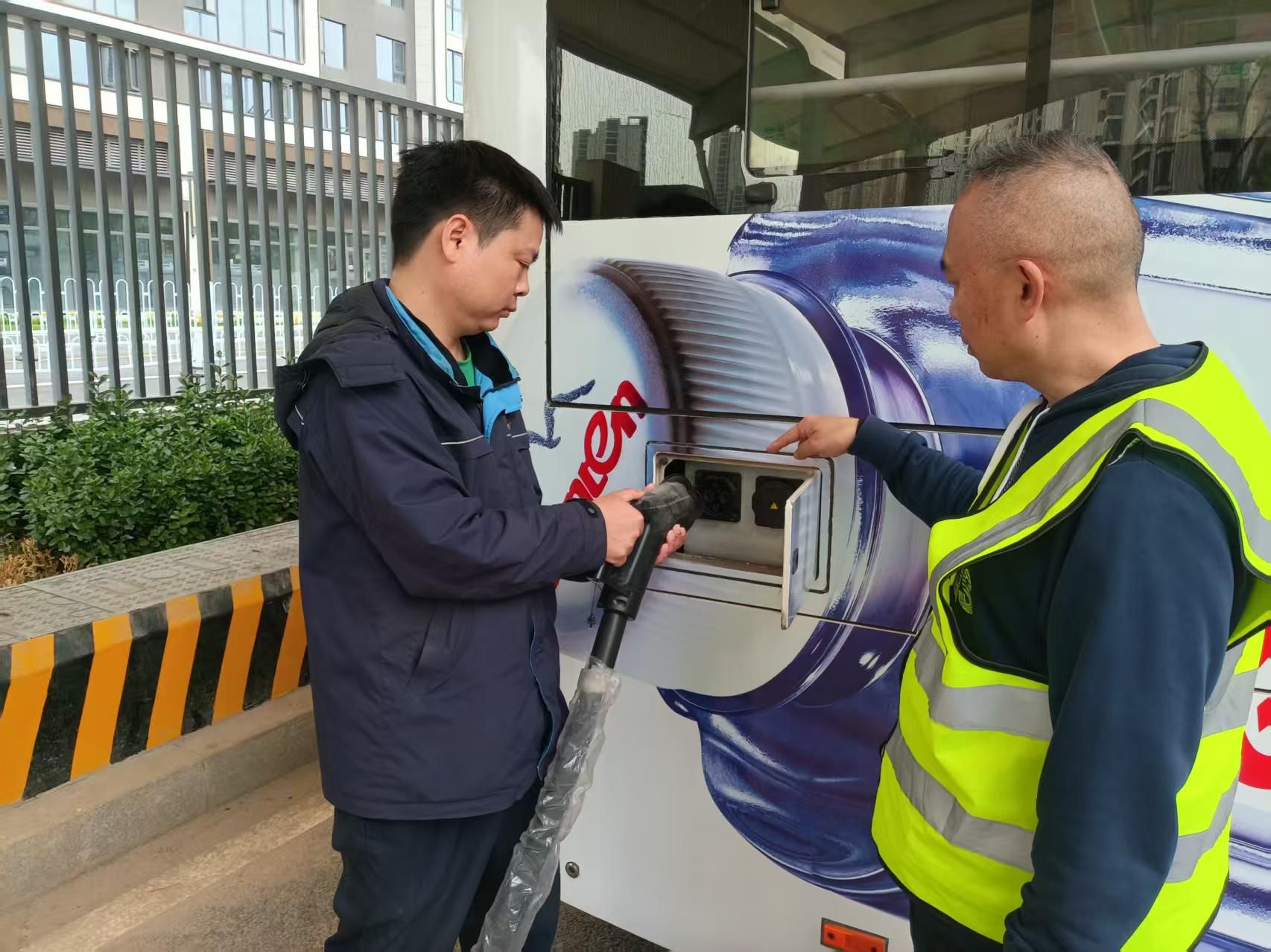 为预防暴风雨天气对场站充电桩的影响,安全员王平指导司机熊志立安全充电。