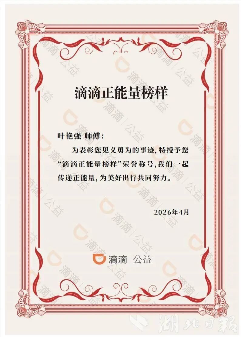 得知叶艳强的事迹后,滴滴公益授予他“滴滴正能量榜样”称号,并通过“滴滴正能量在路上公益专项计划”给予1000元现金奖励。