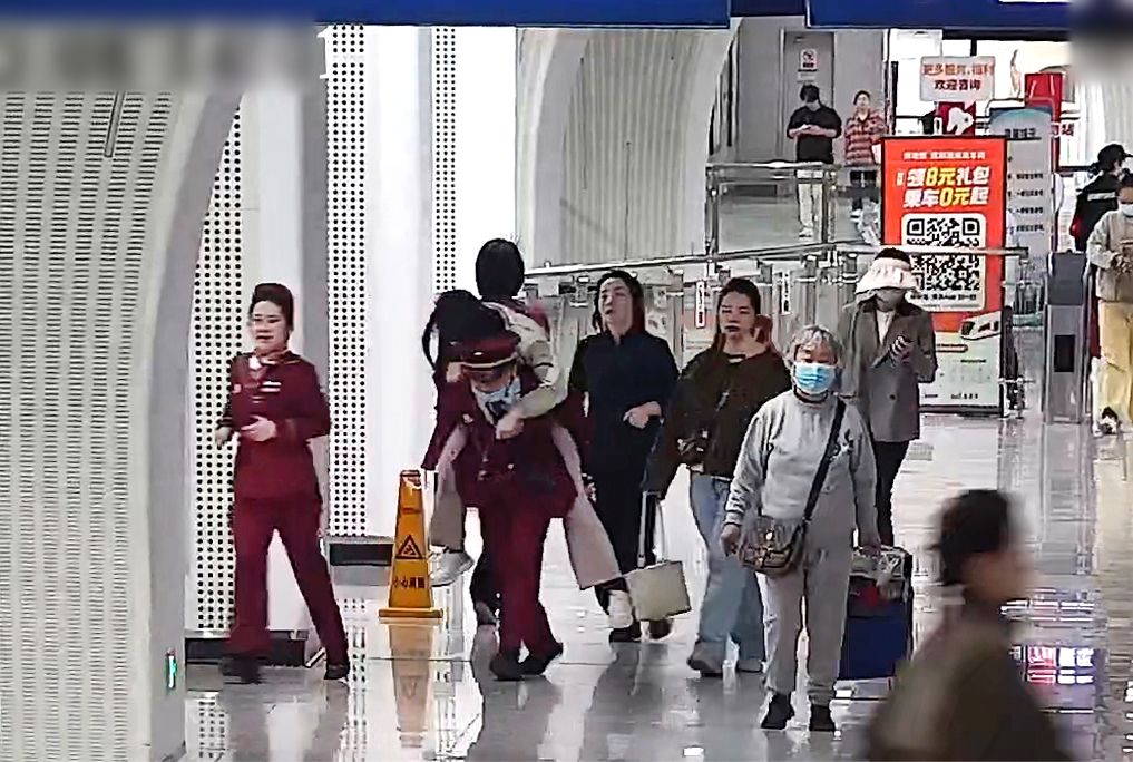 当列车抵达徐家棚站开门时,该乘客意识略有恢复,自行走下车门。然而刚迈出几步,她便再次晕厥倒地。两名热心乘客与车站工作人员黄磊见状,连忙上前搀扶,把她护送至站厅客服中心休息。途中,由于体力不支,该乘客又一次瘫软。黄磊当即蹲下身,在两名热心市民的协助下,背起乘客快速送往客服中心。随后,工作人员迅速推来轮椅,将乘客安置在轮椅上休养。