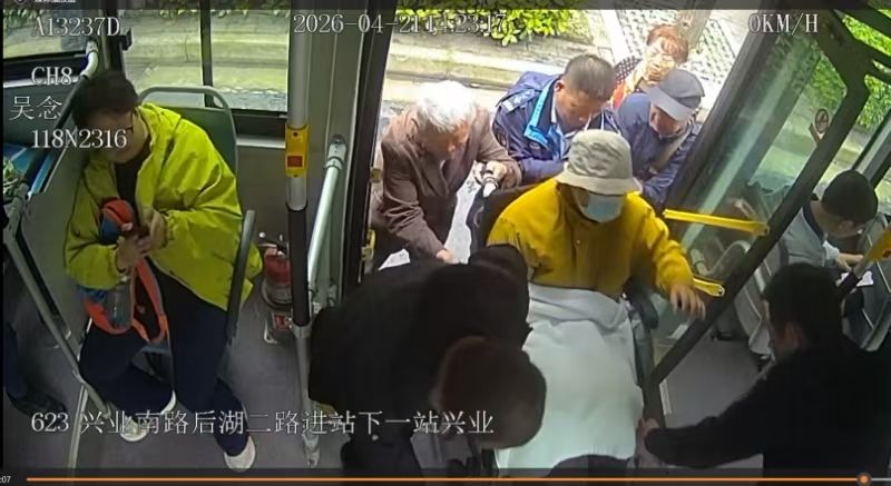 4月21日,623路司机和乘客帮助老人上车。