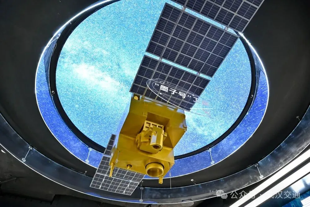 在位于安徽省合肥市的中电信量子信息科技集团有限公司科技体验馆内拍摄的“墨子号”量子卫星模型(2025年7月1日摄)。新华社记者 张铖 摄
