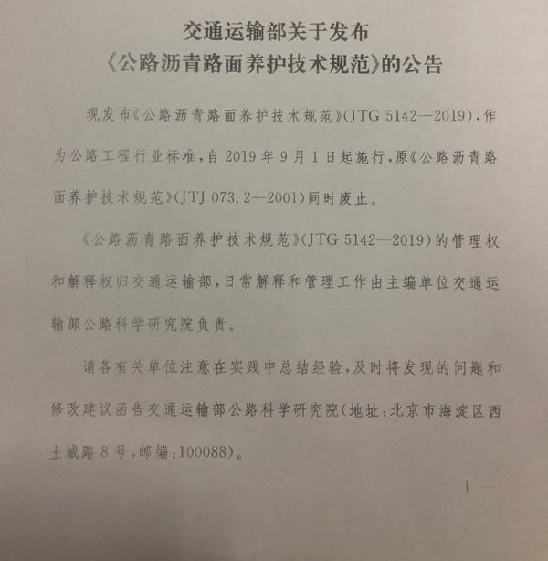 交通运输部关于发布《公路沥青路面养护技术规范》的公告