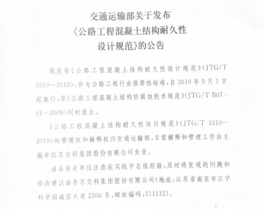交通运输部关于发布《公路工程混凝土结构耐久性设计规范》的公告