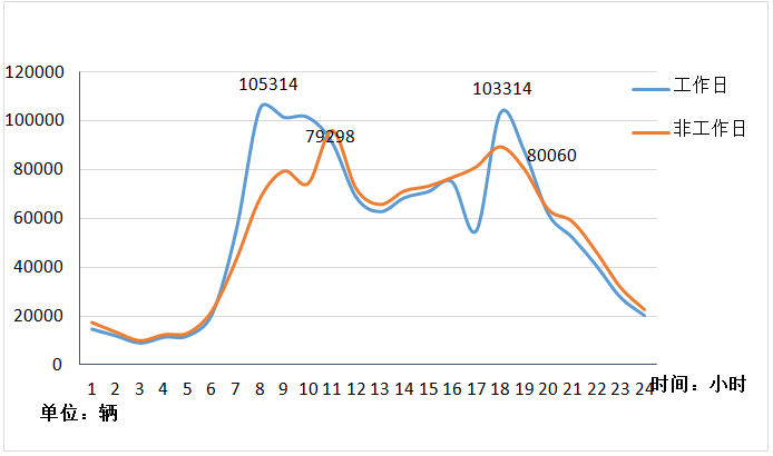 本周工作日上午高峰在7-8点,日均早高峰交通量10.53万辆;下午高峰在17-18点,日均晚高峰交通量10.33万辆。非工作日早高峰在10-11点,晚高峰在17-18点。