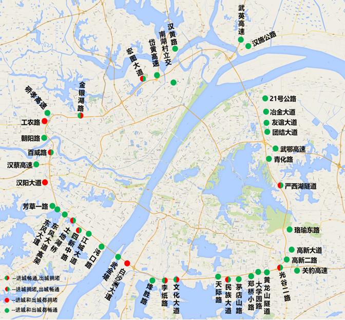 早高峰进三环方向严西湖隧道5、郑桥小路5、民族大道4、文化大道4、白沙洲大道5、汉阳大道5、工农路5、金银湖路5、宏图大道5为常发拥堵路段,出三环方向青化路5、光谷二路5、茅店山路4、文化大道5、李纸路5、白沙洲大道5、工农路4、宏图大道4为常发拥堵路段。(注:拥堵点位右上标数字代表拥堵的工作日天数)